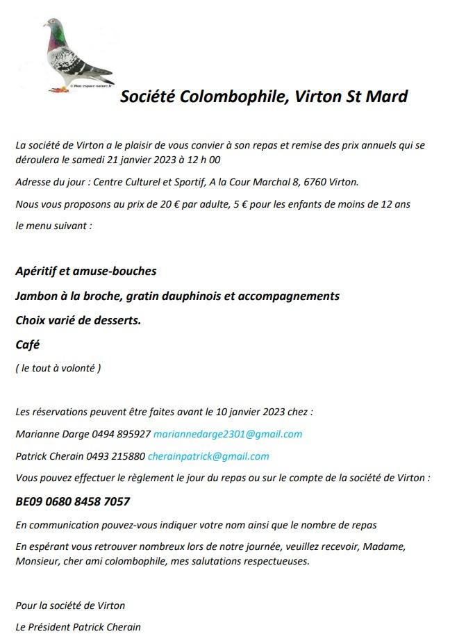 - Vente finale de bons, plusieurs colonies championnes nous font l'honneur de nous offrir soit un jeune 2023, un pigeon adulte présent le jour de la vente ou un couple d'œufs.