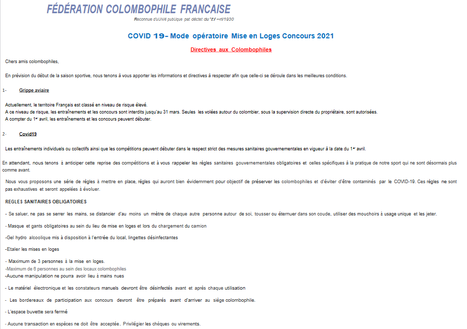 SAISON COLOMBOPHILE.....suite aux dernières mesures gouvernementales