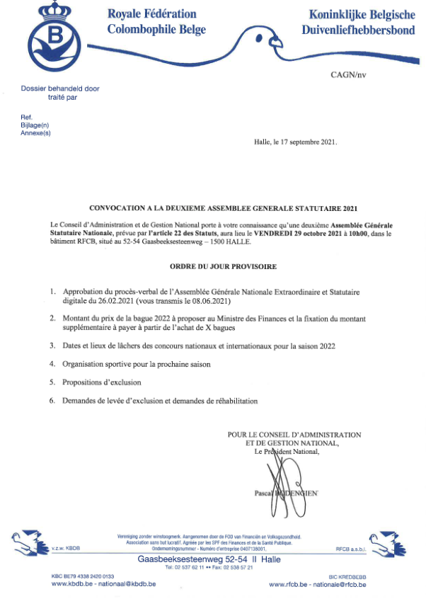 24-09-21 Assemblée Générale Nationale 29-10-21 – ordre du jour provisoire / 24-09-21 Nationale Algemene Vergadering 29-10-2021 – Voorlopige dagorde