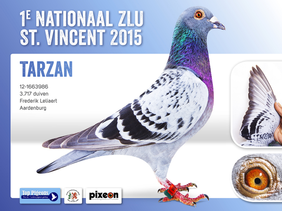 - "Tarzan" PEDIGREE ICI 1er National St Vincent 2015, un pigeon tardif avec 4 plumes de nid. Ce « jeunot » était le seul pigeon en Hollande le jour du lâcher. Il n’a pas gagné cette course juste en ouvrant les ailes pour se laisser porter par le vent : il s’est fait constater à 21h42’, pour 915 kilomètres depuis le point de lâcher à son colombier, bon pour une vitesse de 1008 mpm. Chapeau avec 4 plumes de nid.