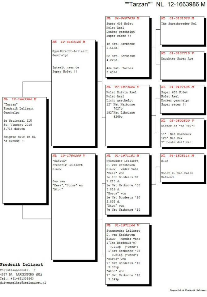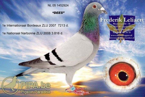 "Dees" 1452924-NL05 gagne 1er International 7213 p. Bordeaux 2007, mais aussi 1er National de 3816 p. Narbonne 2008. En 2010, son frère "Horus" 123924-09 gagne le 1er National 3835 p. Bordeaux yearlings. Sur ce même concours, un autre frère "Aton" gagne le 104ème prix, pour faire un 7e National 3849 p. Narbonne la même année. Une sœur de Dees, Horus et Aton est mère du ’"Tarzan", 1er National St Vincent , une autre sœur de ces supers pigeons est mère du "De Jan" 4100613/11), un pigeon d’exception, avec des prix comme le 1er / 3470 p. Bourges 2012, 6 / 3610 p. Limoges 2013, 6 / 1480 p. Libourne 2013, 22 / 3960 p. Châteauroux 2012, etc. Un petit-fils de Dees, "Eduardo" a lui été couronné, as pigeon WHZB 2010, avec les prix suivants : 11 / 3850 p. Nal Narbonne ; 17 / 2950 p. Tarbes, 94 / 3835 p. Bordeaux.