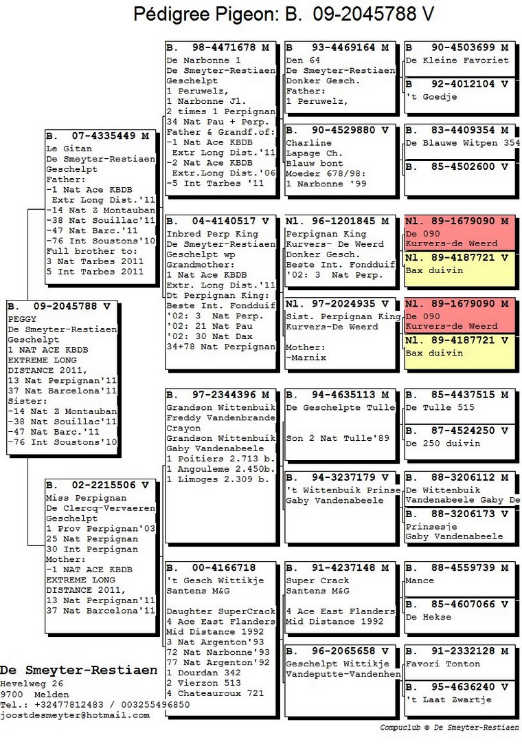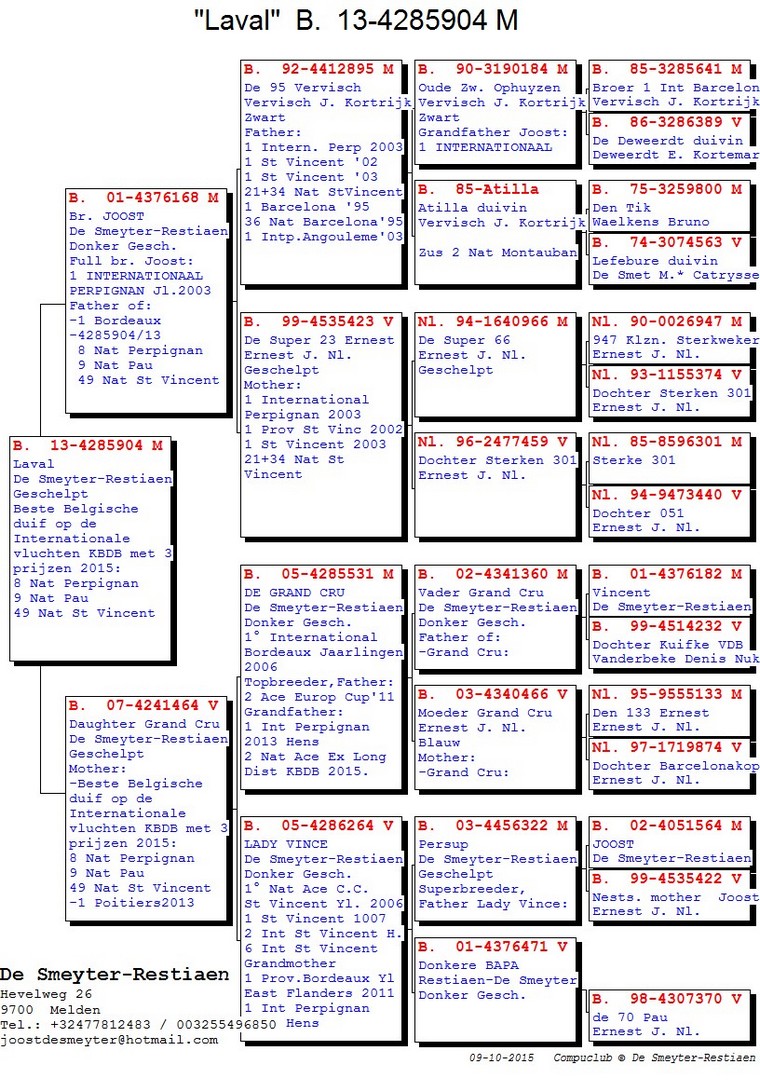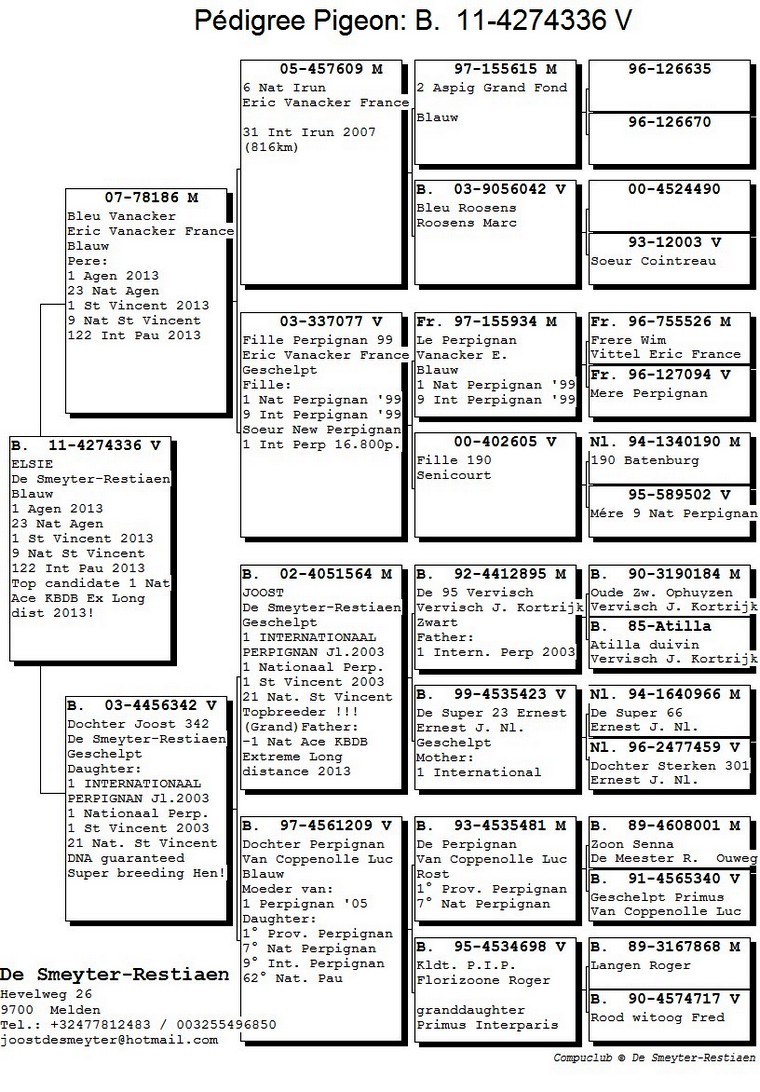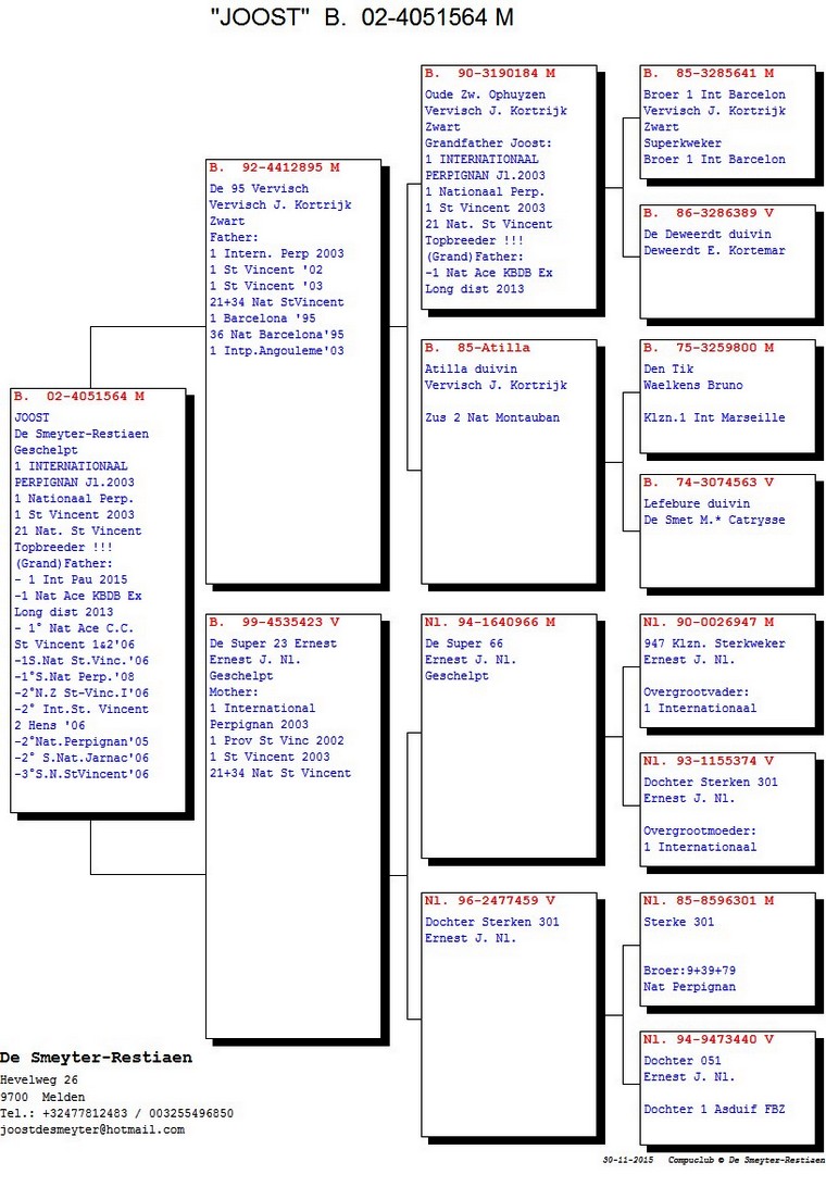 Père: « Son Joost » 4456329-BE03 Super reproducteur, père du 5ème As pigeon National Fond Yearlings RFCB 2014, c’est un fils du « Joost » 4051564-BE03 1er international perpignan Yearlings 2003 & d’ «Aske 2001” 204376104-BE01 1er As pigeon Fond Jeunes Derby Hainaut 2001