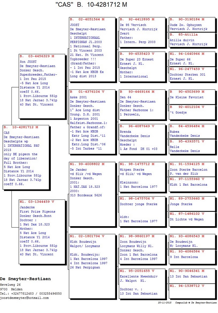En cette saison 2015, 1er International Pau avec « Cas » 4281712-BE10 qui n’est autre qu’un petit fils d’un autre vainqueur International chez De Smeyter-Restiaen, je parle ici du « Joost » qui remporta la victoire International sur Perpignan en 2003 ! Bon sang ne saurais mentir car « Cas » 4281712-BE10 est également un frère du 5ème As Pigeon National Fond Yearlings RFCB 2014