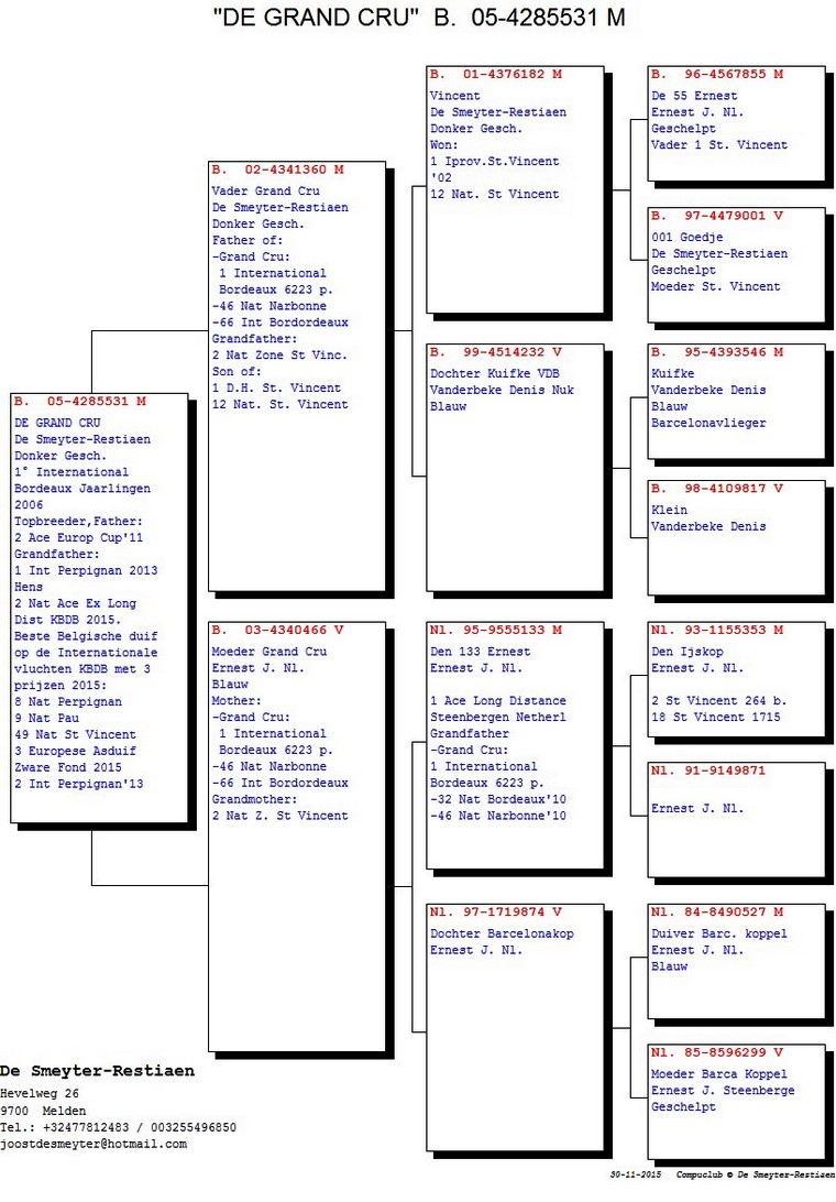 Pour rappel « Nuna » Vainqueur International Femelle Perpignan et 2ème International 2013 chez Yvan Haelters de Nukerke provient de chez De Smeyter-Restiaen, Le père est « Den Biarritz » 4376170-BE01 aux origines Van Dyck K. (PB) & Ernest J. (PB). La mère est « Grand Cru Vince » 4241275-BE07, elle-même fille de « Grand Cru » 1er international Bordeaux Yearlings 2006 & de « Lady Vince » 6ème international Saint-Vincent 2006 & As pigeon National Cureghem Centre 2006