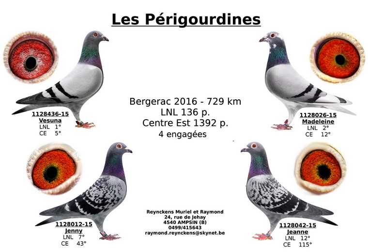 Voici 3 ans, toute la colonie fut cependant mise en vente publique. En 2015, avec l’aide de Muriel, Raymond redémarra son sport avec quelques pigeons issus principalement de son ancienne souche, récupérés par ci, par-là. L’équipe des yearlings du nouveau tandem Reynckens Raymond & Block Muriel a déjà fait parler la poudre en 2016, avec comme point d’orgue un terrible Bergerac CE, où l’on note 4 prix de 4 engagés :