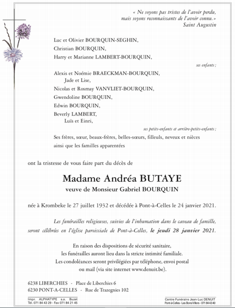 Décès de Mme Butay Andréa veuve Gabriel BOURQUIN