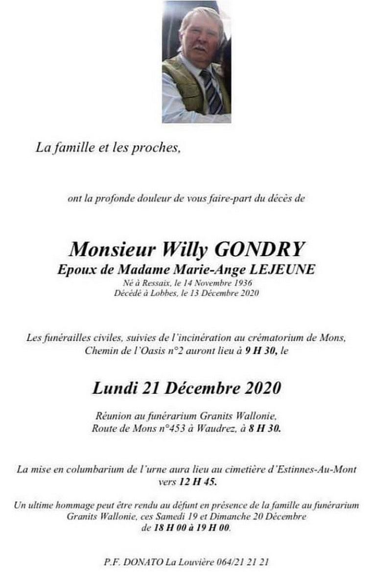 Monsieur Willy GONDRY (84 ans) de Estinnes-au-Mont, décédé le 13/12/2020.