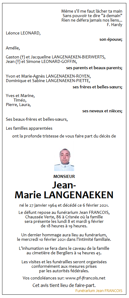 Jean-Marie repose au Funérarium Jean François, Chaussée Verte, 86 à Crisnée, où les visites sont prévues ces Lundi 8 et Mardi 9 Février, de 18 H. à 19 H.