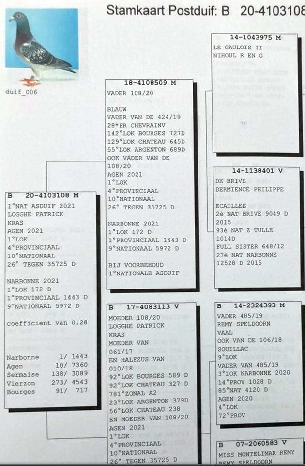 Mère: '355/00' (baguée vieille bague), mère de la 104e international Marseille 10.333 p en '10, également 12e internationale femelle et 3e belge.