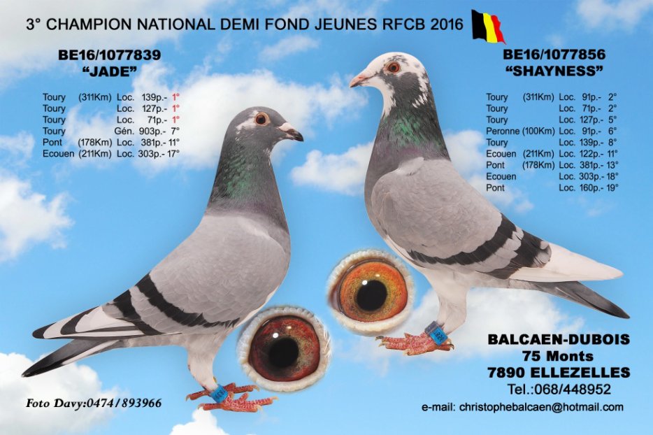 La colonie Balcaen-Dubois à remporté & remporte de nombreux classements chaque saison dans les championnats les plus prestigieux tant au niveau provincial qu'au niveau National dans ses disciplines de prédilection c-à-d Vitesse & demi-fond, sans oublier quelques incursions dans le fond. BON EN VENTE ICI