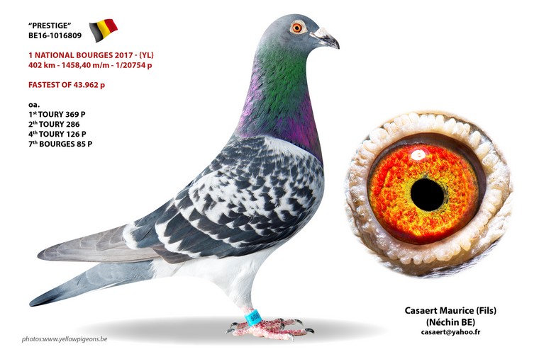 Seizoen na seizoen schittert Maurice met zijn kleine kolonie waar je moet uitrusten om te blijven! Het bewijs is eind mei 2017, op een hete en donderende Bourges, Maurice wint met "Prestige" 1016809-BE16 de nationale overwinning op Bourges Jaarlingen van de Union Brabançonne en tegelijkertijd de hoogste snelheid van alle deelnemers!