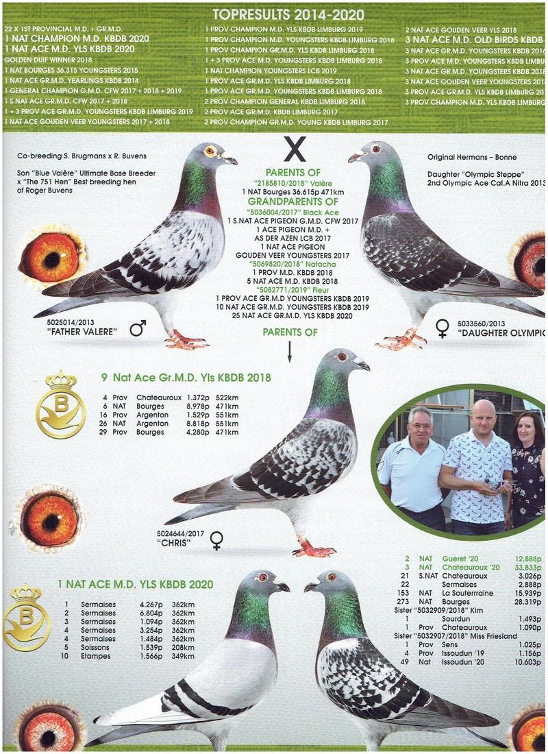 1er Kampioen National KBDB Kleine Halve Fond Oude & Jaarlingen - Champion National RFCB Petit Demi-Fond Vieux & Yearlings 2020 1er, 12e As-duif Kleine National KBDB Halve Fond Jaarlingen - As-pigeon National RFCB Petit Demi-Fond Yearlings 2020 1er Beste Kolonie Nationaal - Meilleures colonies National LCB 2020 1er Algemeen klassement nationaal oude/jaarse - Meilleures colonies National vieux/yearlings LCB 2020 2e As des As Nationa(a)l LCB 2020 3e As-duif National KBDB Kleine Halve Fond Oude - As-pigeon National RFCB Petit Demi-Fond Vieux 2020 4e As-duif National KBDB Grote Halve Fond Jonge Duiven - As-pigeon National RFCB Grand Demi-Fond 2020 5e Kampioen Algemeen National KBDB - Champion Général National RFCB 2020 6e Kampioen National KBDB Grote Halve Fond Oude & Jaarlingen - Champion National RFCB Grand Demi-Fond Vieux & Yearlings 2020 5e, 9e, ... As des As Nationa(a)l LCB Vieux & yearlings 2020 2e National Gueret 12888d. 2020 3e, 19e National Châteauroux 33833d. 2020 5e National Gueret 7175d. 2020 10e, 21e National Argenton 23280d. 2020 17e National Argenton 26085d. 2020 22e National Bourges 22506d. 2020 31e, 37e, 60e National Châteauroux 15322d. 2020 33e, 62e National La Souterraine 9469d. 2020 49e National Issoudun 10603d. 2020 60e National Tulle 4451d. 2020 61e National Argenton 16762d. 2020 63e National Issoudun 18176d. 2020 69e National Tulle 3064d. 2020 70e National Châteauroux 15322d. 2020 81e, 87e National Argenton 23280d. 2020 88e National La Souterraine 15939d. 2020