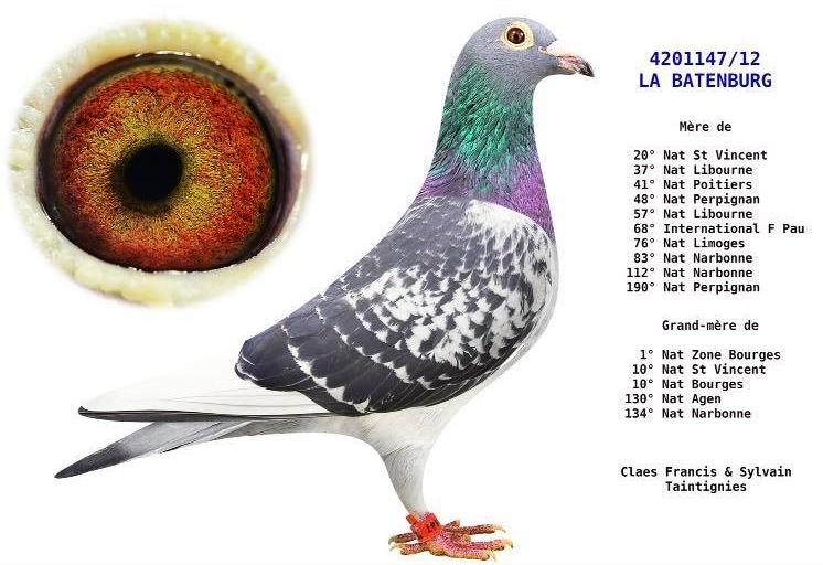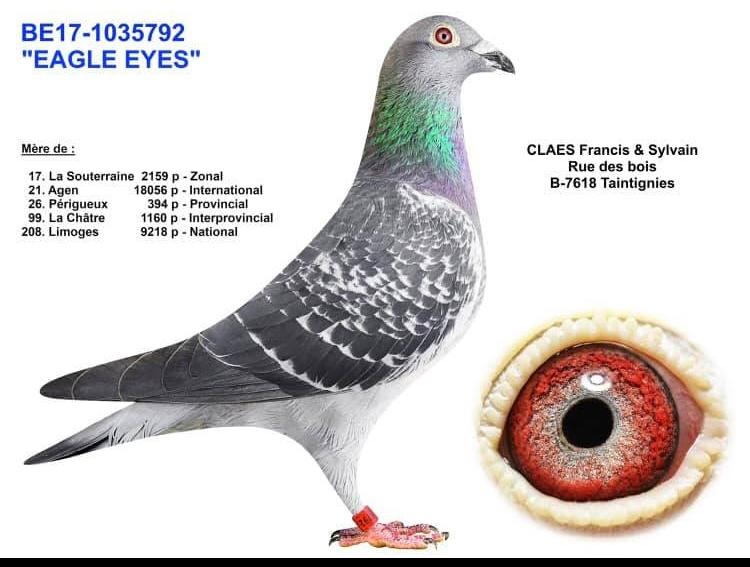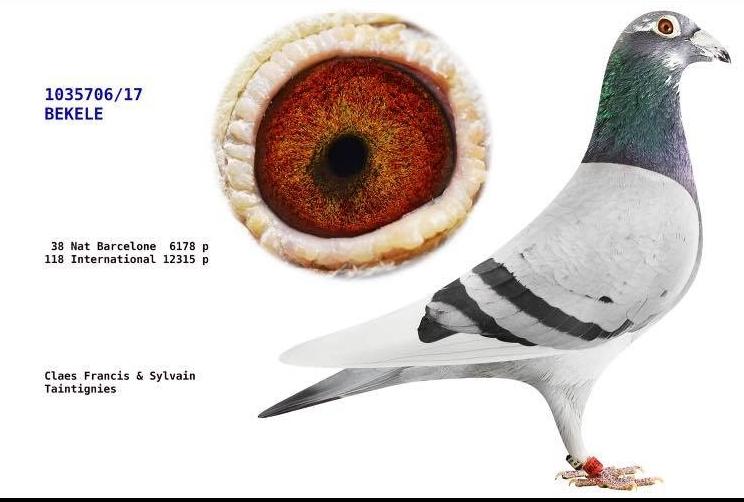 Mère est la 1035778-BE17, fille du BE06-4146192 de Louis Van Paesschen, Brother/frère du 19. National Barcelone, accouplé sur la super reproductrice qui provient en direct du pigeonnier Batenburg, achetée comme œuf par Roger Debusschere, la BE12-4210147 est une fille du 84. National Perpignan. Elle est consanguine sur le fameux "Jonge Witbuik". pédigree.