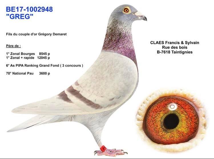 Son père est un fils direct du fameux Couple d’or de Gregory Demaret d’Hercquegies. Le 1002948-BE17 est par conséquent un frère des 8. Et 11. As Grand-fond chez Gregory où ils sont parents ou grands-parents de près de 100 prix de fond… 9036292-BE10 est le mâle du couple, un pigeon d’origine Houfflijn tandis que la femelle 9107889-BE10 est d’origine Marcel Aelbrecht