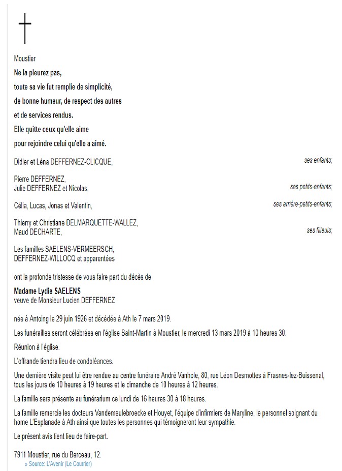 Décés de Mme Saelens Lydie