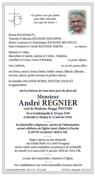 Visites souhaitées en son domicile, rue Emile-Noël 54 à 5660 Presgaux les mardi 14 et mercredi 15 janvier 2020 de 15h à 19h. Les funérailles religieuses seront célébrées en l'église Saint-Hubert à Pesche le JEUDI 16 janvier 2020 à 14h.