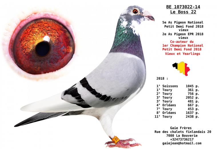En 2018, les frères Gaie ont remporté le titre de 1er Champion National petit demi-fond RFCB et ce grâce à l'aide de deux pigeons exceptionnels! Ces pigeons se classèrent également 3e et 5e As Pigeon National RFCB 2018 ainsi que 1er et 2e as pigeon provincial RFCB. Avec leur colonie principalement basée sur les pigeons de Casaert M&G, leur palmarès compte également plusieurs performances exceptionnelles remportées dans les nationaux, comme par exemple le 1er National Châteauroux de 20.139 pigeons en 2011 (avec la plus grande vitesse des 45.908 engagés), le 1er National Bourges I de 16.442 pigeons en 2012 après quoi ils se classèrent 2e Champion National Grand Demi-Fond RFCB en 2016. Bon en vente ICI De beroemde gebroeders Gaie werden in 2018 nog afgevlagd als 1e kampioen kleine halve fond KBDB met een ploeg duiven van uitzonderlijke kwaliteit! Ook hadden zij in 2018 de 3e en 5e Nationale asduif KBDB in huis, samen met de 1e en 2e provinciale asduif KBDB. 1e National KBDB Kleine Halve Fond Oude & Jaarlingen / 1er Champion National RFCB Petit Demi-Fond Vieux & Yearlings 2018 REPORT LCB3e & 5e As-duif Nationaal Kleine Halve Fond Oude 20183e & 5e As-pigeon National Petit Demi-Fond Vieux 20182e Gouden Duif België 2018Superstars van het Jaar Halve Fond 20182e Champion National Jeunes LCB 20183e As des As Pigeons Nationaux Jeunes LCB 20181er As des As Wallonie LCB 20181er & 2e As pigeon Hainaut-Brabant Wallon Petit Demi-Fond 2018 2e As pigeon Hainaut-Brabant Wallon Grand Demi-Fond Jeunes 2018