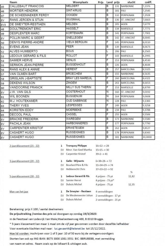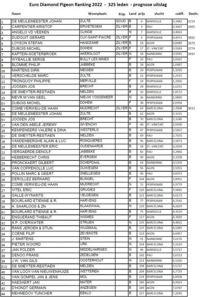 Euro Diamond Pigeon Ranking 2022 provisoire/Voorlopige