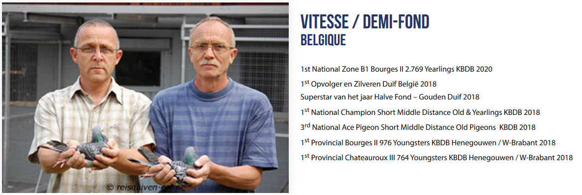 En 2018, les frères Gaie ont remporté le titre de 1er Champion National petit demi-fond RFCB et ce grâce à l'aide de deux pigeons exceptionnels! Ces pigeons se classèrent également 3e et 5e As Pigeon National RFCB 2018 ainsi que 1er et 2e as pigeon provincial RFCB. Avec leur colonie principalement basée sur les pigeons de Casaert M&G, leur palmarès compte également plusieurs performances exceptionnelles remportées dans les nationaux, comme par exemple le 1er National Châteauroux de 20.139 pigeons en 2011 (avec la plus grande vitesse des 45.908 engagés), le 1er National Bourges I de 16.442 pigeons en 2012 après quoi ils se classèrent 2e Champion National Grand Demi-Fond RFCB en 2016. BON EN VENTE ICI