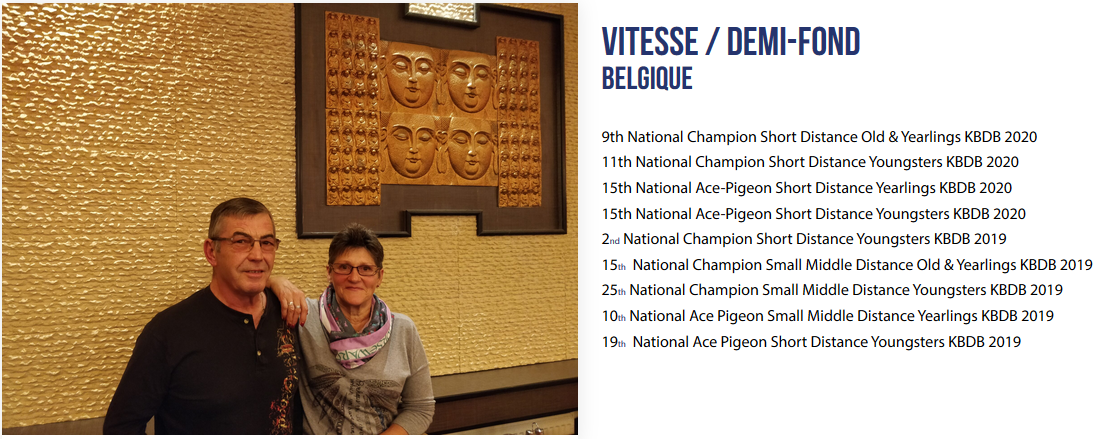 Uitstekende hennuyère-kolonie op snelheid en middellange afstand die al 2 nationale KBDB-titels en vele ranglijsten en provinciale titels heeft gewonnen! In dit seizoen 2019 staat het op de 2e plaats op de Nationale Jeugd Speed Champion-podia en 4 andere nominaties, d.w.z. 5 nationale KBDB-nominaties in 2019, precies dat !!!