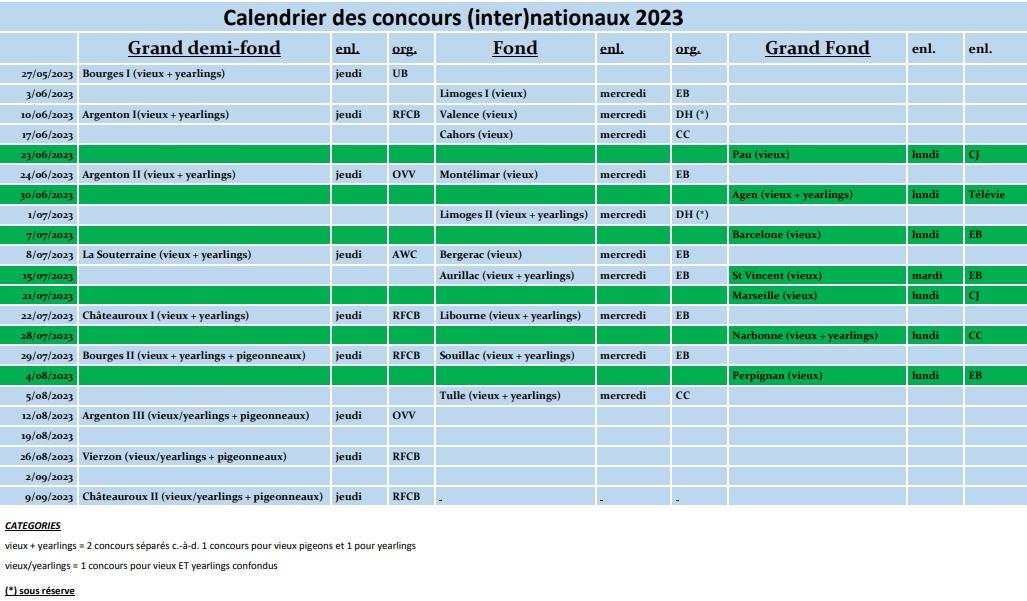 Inversion de Limoges II (vieux pigeons et yearlings) avec Montélimar (vieux pigeons) notamment 24/06/2023 : Montélimar (vieux pigeons) 01/07/2023 : Limoges II (vieux pigeons et yearlings)