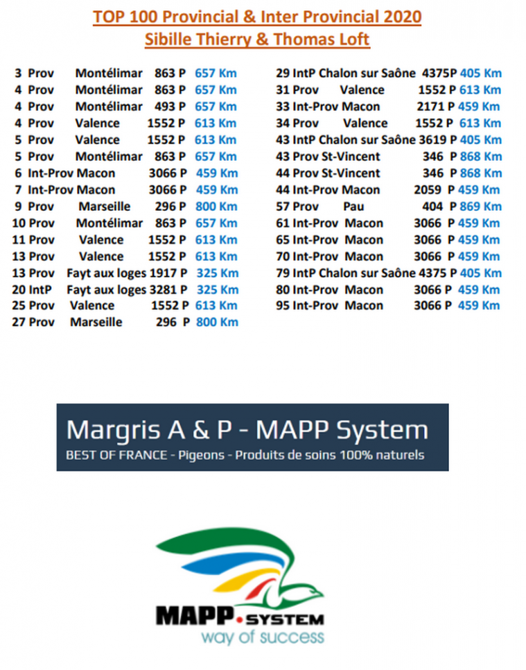 Over de tandem Thierry en Thomas Sibille gesproken is een duivensport die weinig gebreken vertoont! Thierry, begon met de duivensport op 12-jarige leeftijd, maar zijn eerste licentie tekende hij twee jaar later in 1975 in Courcelles, waar hij nog steeds woont. Sindsdien verzamelt hij de top 100 nationaal en internationaal op fond- en fondvluchten. Zozeer zelfs dat de vader & zoon-vereniging een van de absolute referenties van het Koninkrijk is op de beroemde "Rhône-lijn". En op de middelste rij is de oogst ook mooi. Duiven die houden van de "klassiekers", de moeilijkheidsgraad, en die altijd een fijn gevoel van "stalling" hebben getoond omdat er altijd heilige aanwijzingen zijn geweest in de Sibille Loft.