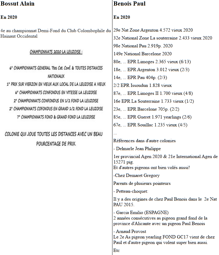 En 2021 Chez Benois Paul 99e, ... Zone Wallon Limoges I 1.226p. (10/18) 53e Zone Wallon Argenton I 1.586 Yearlings (1/1) 47e Zone Wallon Valence 40e & 101e Zone Wallon Pau (2/2) 16e, 51e, 54e, 70e, ... Zone Wallon Brive (5/10) 34e Zone Barcelone 340p. (1/3) Des prix remportés également sur Limoges II, Issoudun, Cahors, Périgueux, ... Infos 2021 complémentaires à venir
